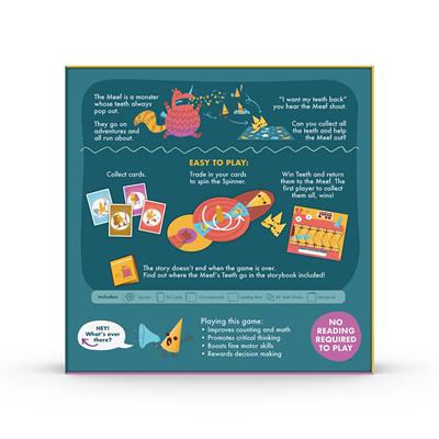 The Meef is a monster who has lost of its teeth and needs your help!! Collect cards and use the Spinner to get closer to filling the Meef’s smile back up. The first one with a full set of teeth wins! With counting practice, fun strategy challenges, and a silly story you can read together, this game is easy for anyone to sink their teeth into. Great for giggle-filled family game nights or one on one bonding time.
