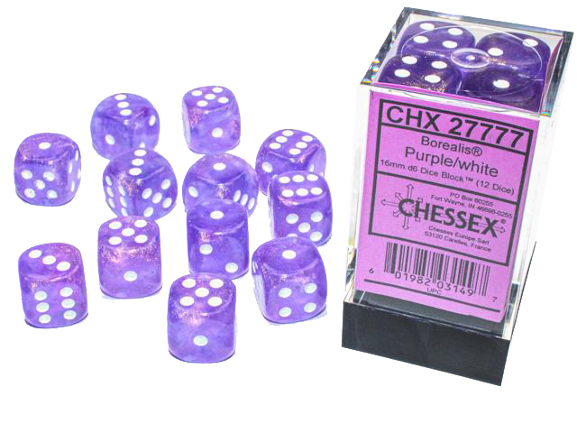 Chessex Dice: Borealis: 16mm Purple/white Luminary Dice Block (12)