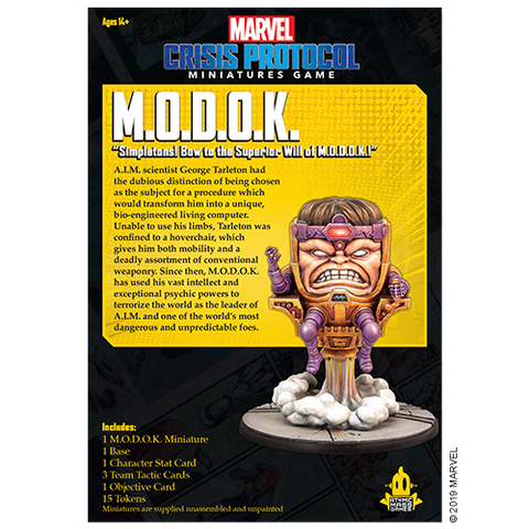 The box contains everything players need to add M.O.D.O.K. to their Marvel: Crisis Protocol collections. Miniatures are supplied unassembled and unpainted.