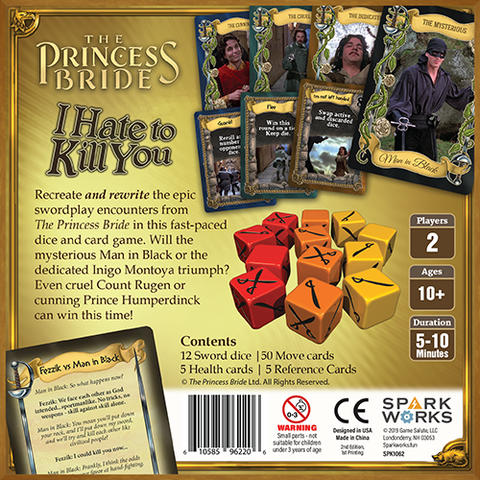 The Princess Bride: I Hate to Kill You is a quick, but crafty, dice and card game that recreates (and re-imagines) the sword duels from The Princess Bride. Play as the Man in Black, Inigo Montoya, Count Rugen, or Prince Humperdinck.